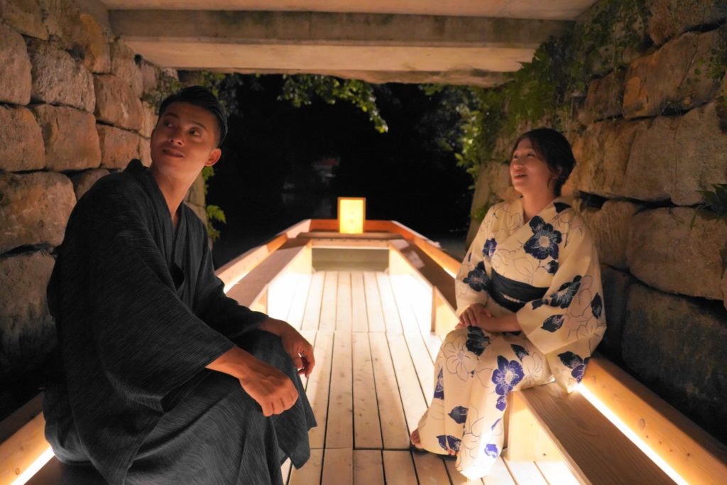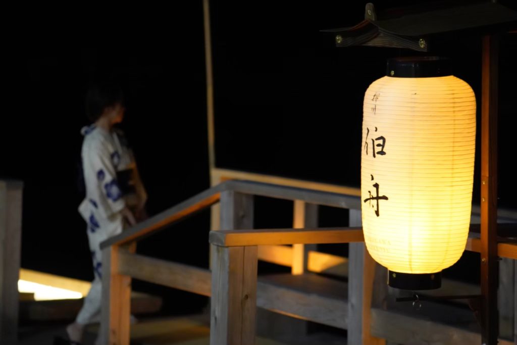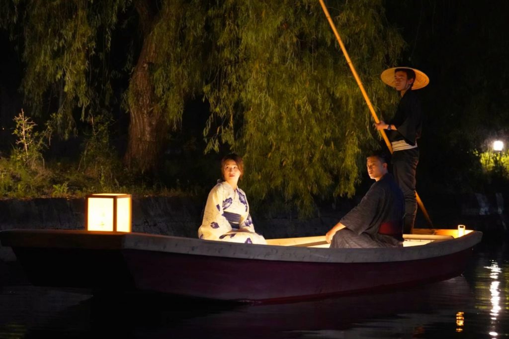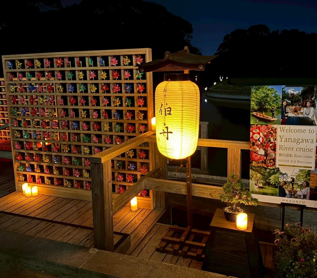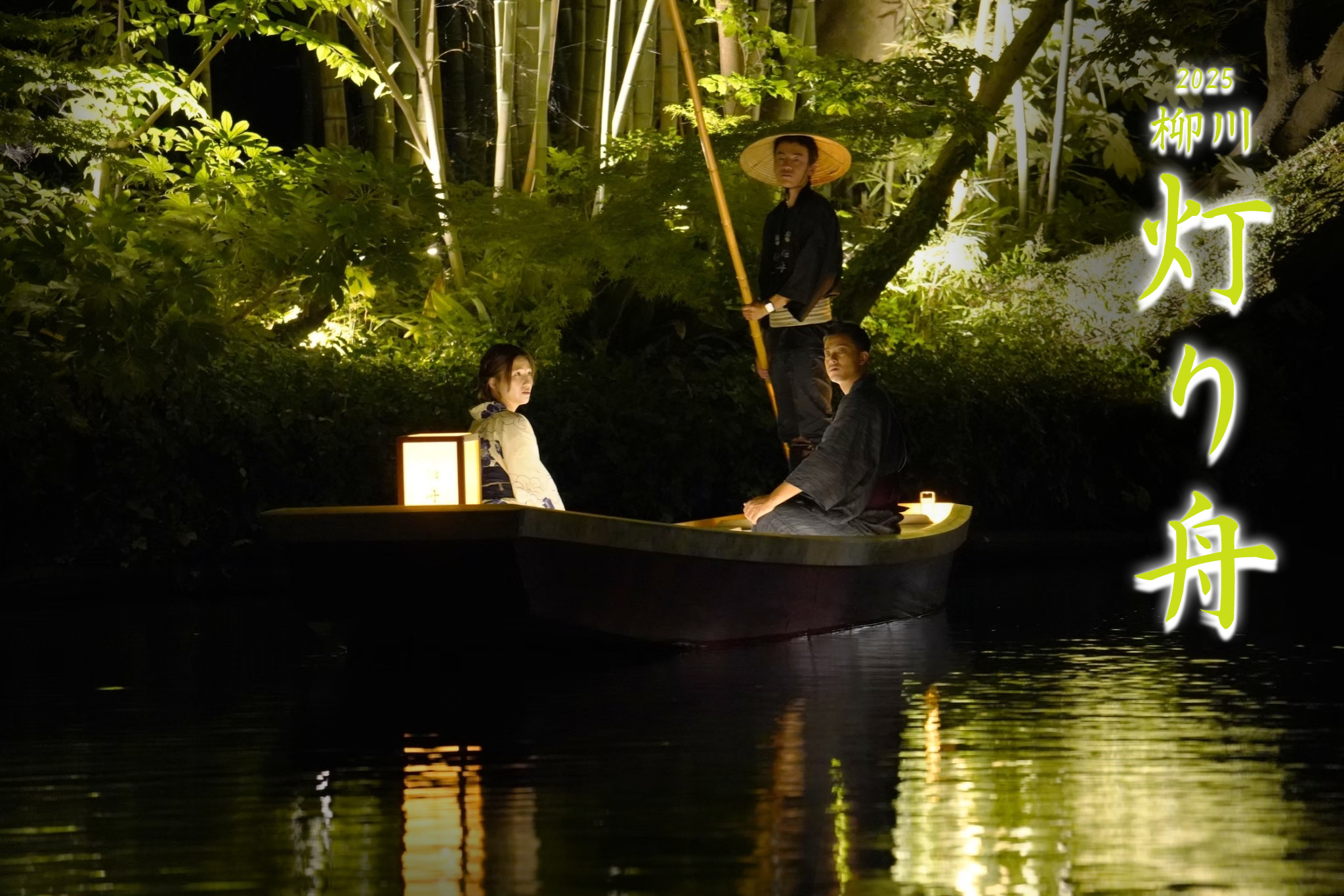 昼間とはまた違った風情を見せる夕涼みの中、特別な夜をお楽しみいただける夜のお堀めぐり「灯り舟」を運航いたします。完全予約制の「灯り舟」のためにライトアップさせた約4kmのお堀を、ゆったりめぐります。この機会にぜひ、夜の柳川の灯り舟をお楽しみくださいませ。